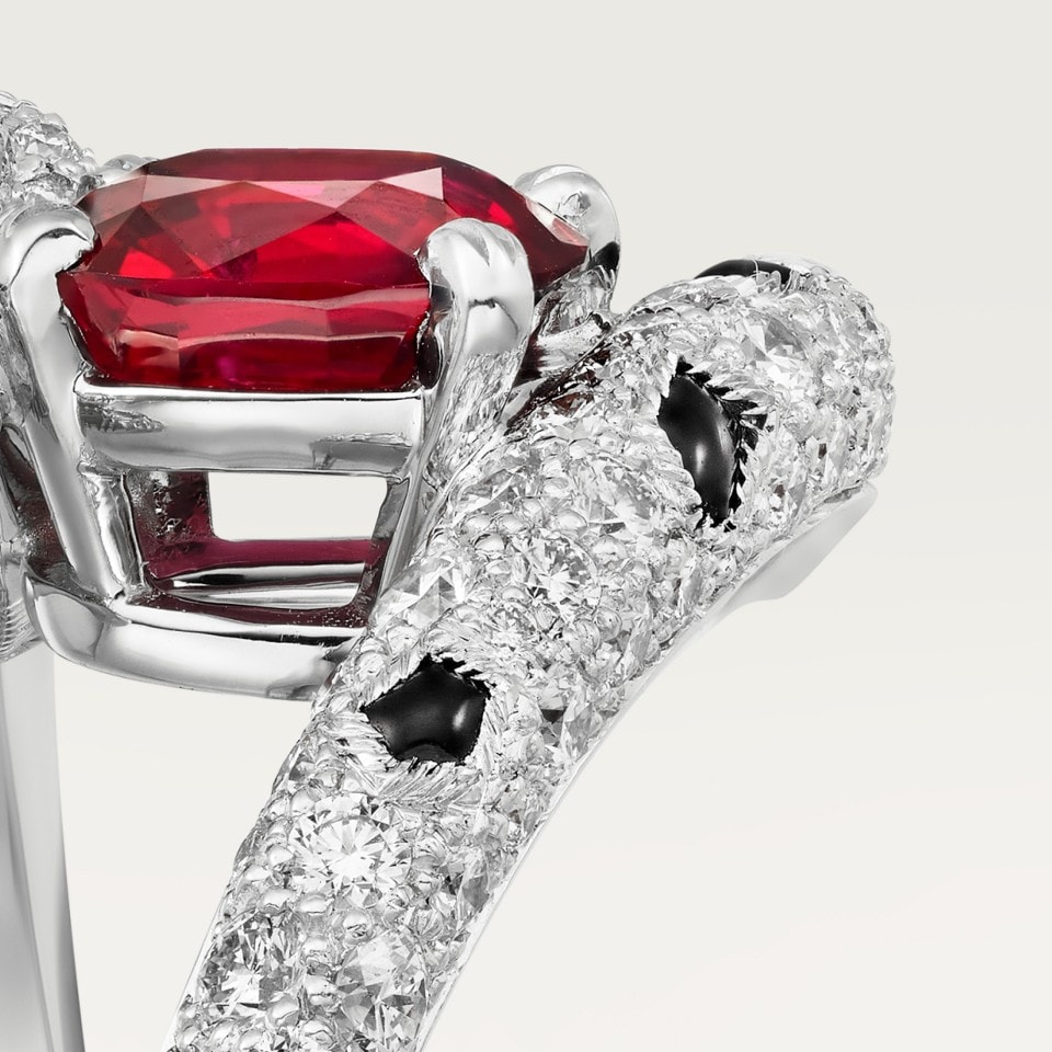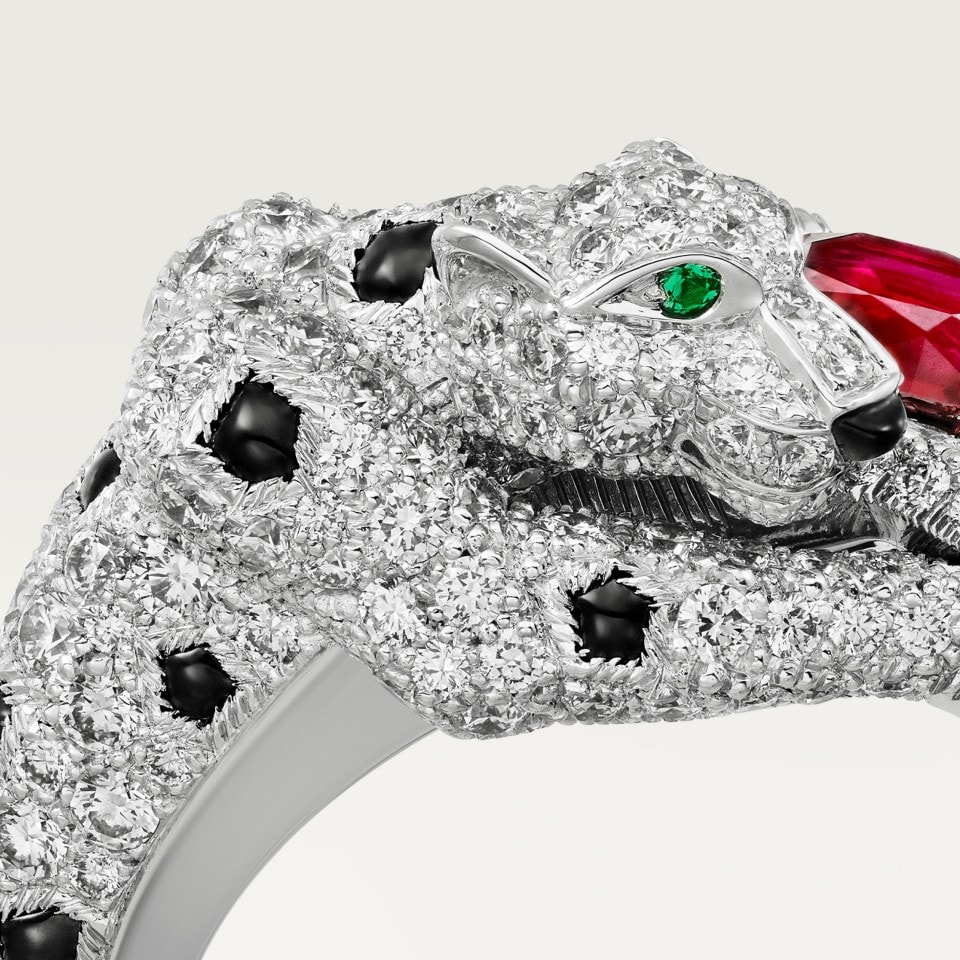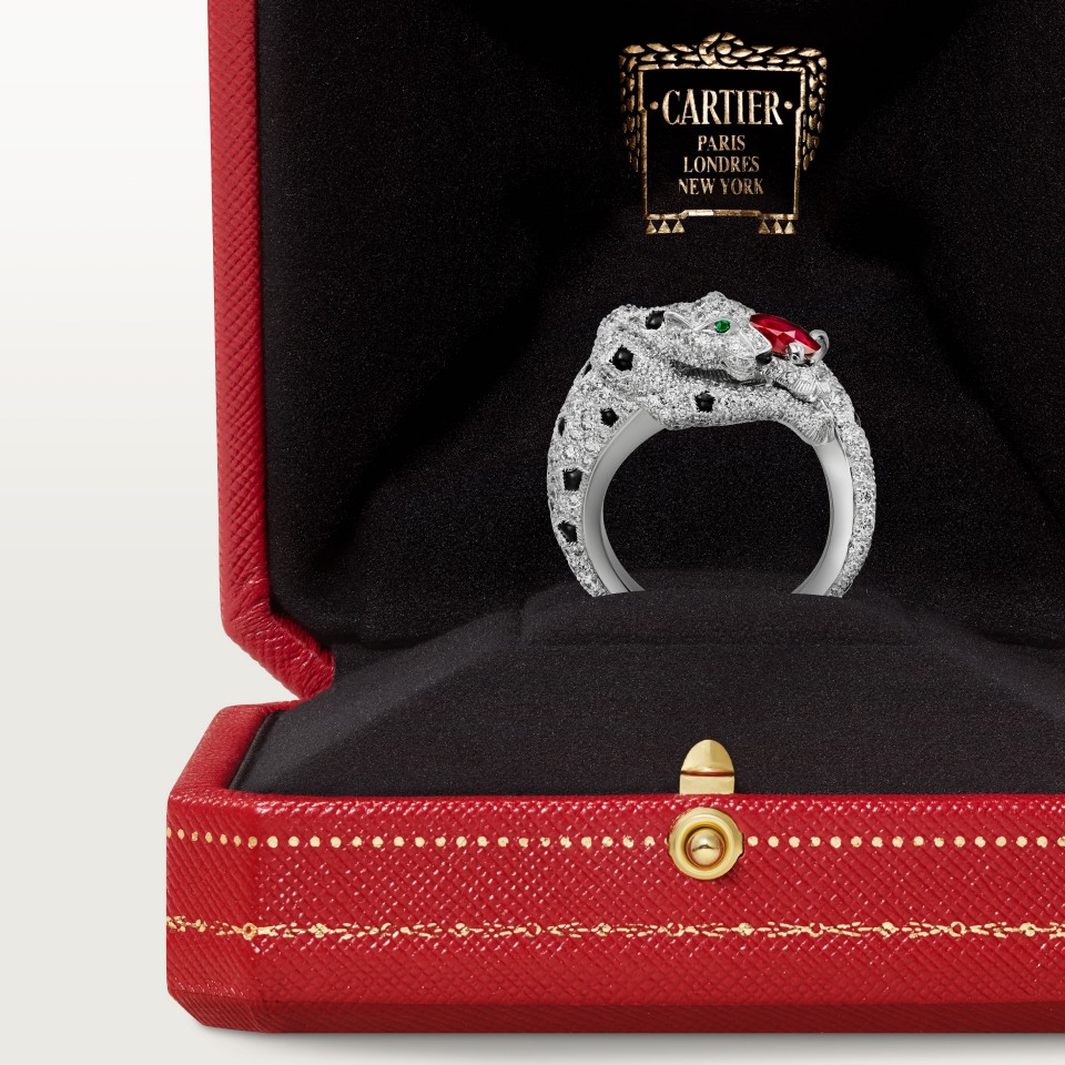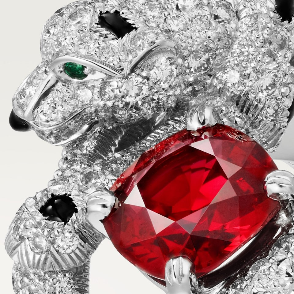Panthère de Cartier戒指,750/1000白金,镶嵌1颗1.74克拉枕形切割红宝石,2颗祖母绿豹目,22颗缟玛瑙豹纹,1颗缟玛瑙豹鼻,264颗总重1.84克拉的钻石。