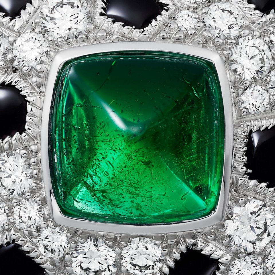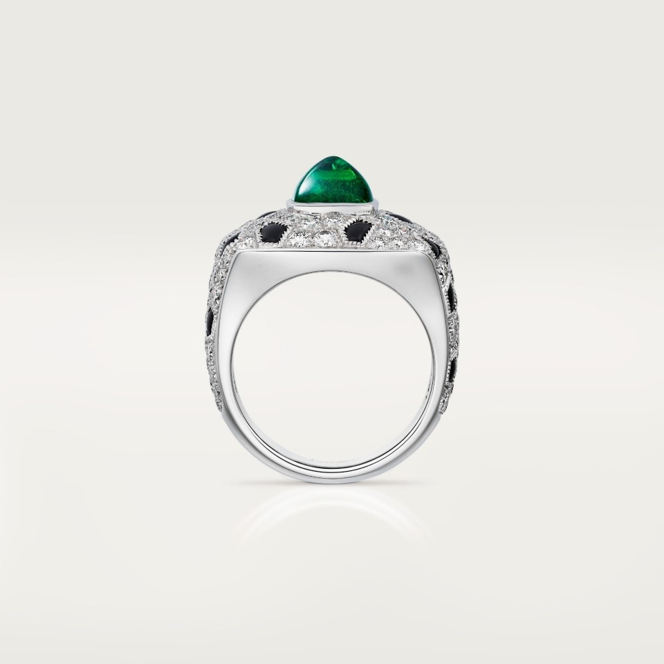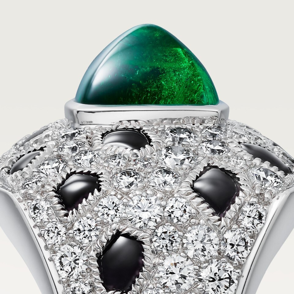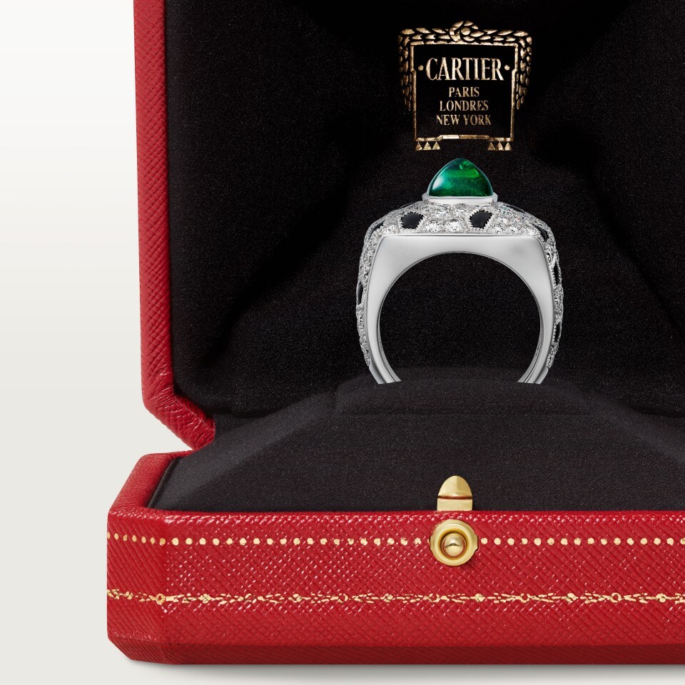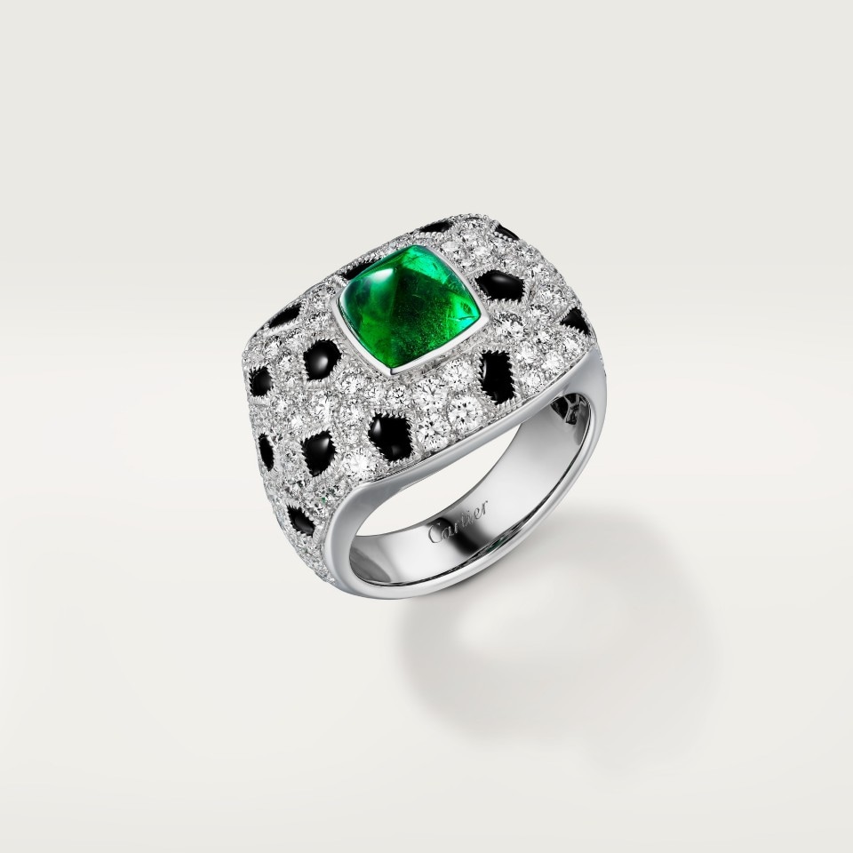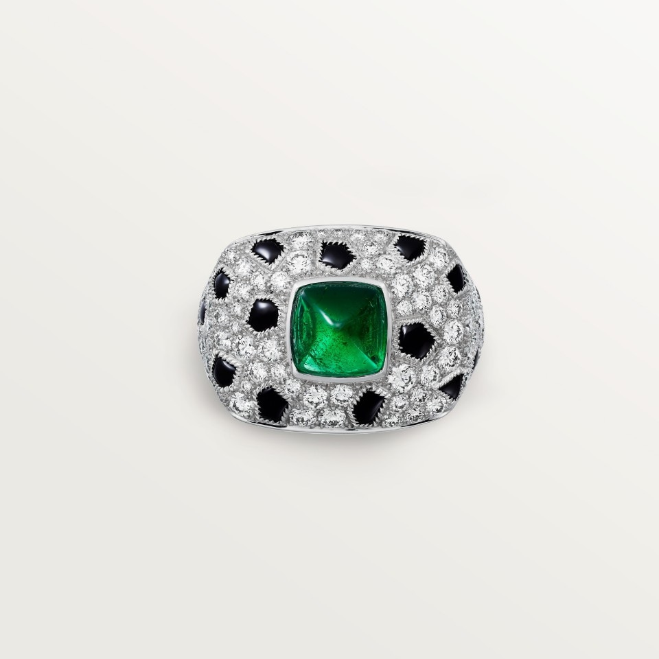 Panthère de Cartier戒指,750‰白金,镶嵌1颗1.8克拉糖包山切割祖母绿,17颗缟玛瑙豹斑,95颗总重1.48克拉的圆形明亮式切割钻石。