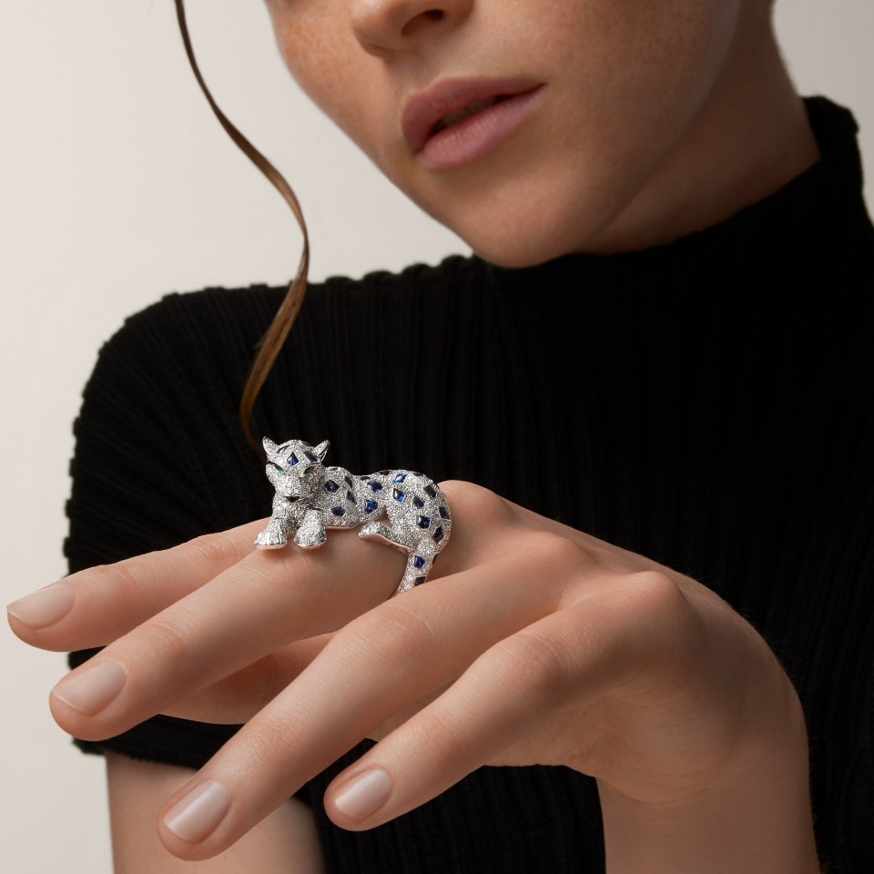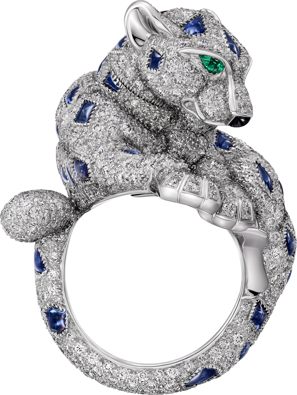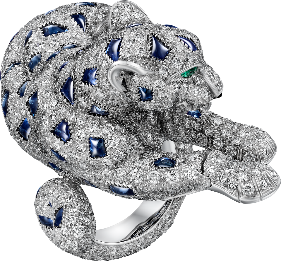Panthère de Cartier卡地亚猎豹戒指,750/1000白金,镶嵌591颗圆形明亮式切割钻石,总重5.12克拉,蓝宝石,祖母绿和缟玛瑙。