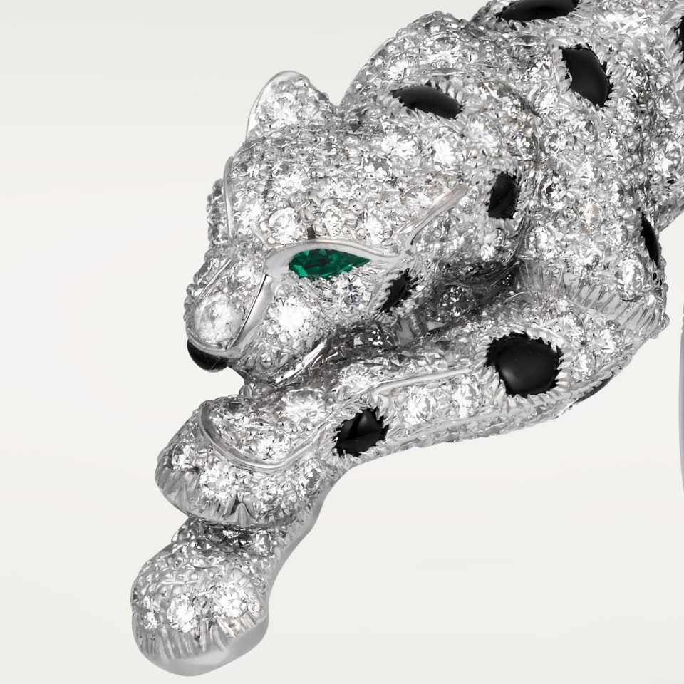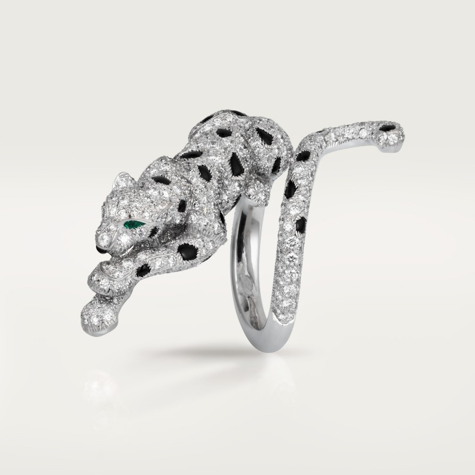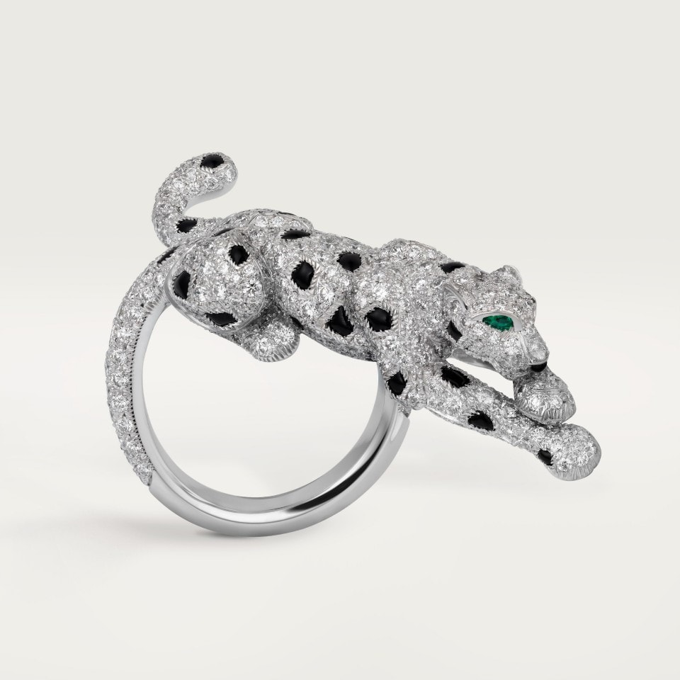 Panthère de Cartier卡地亚猎豹戒指,750‰白金,镶嵌2颗祖母绿豹眼,36 颗缟玛瑙豹斑,1颗缟玛瑙豹鼻,406颗圆形明亮式切割钻石,总重2.33克拉(适用尺寸:52)。