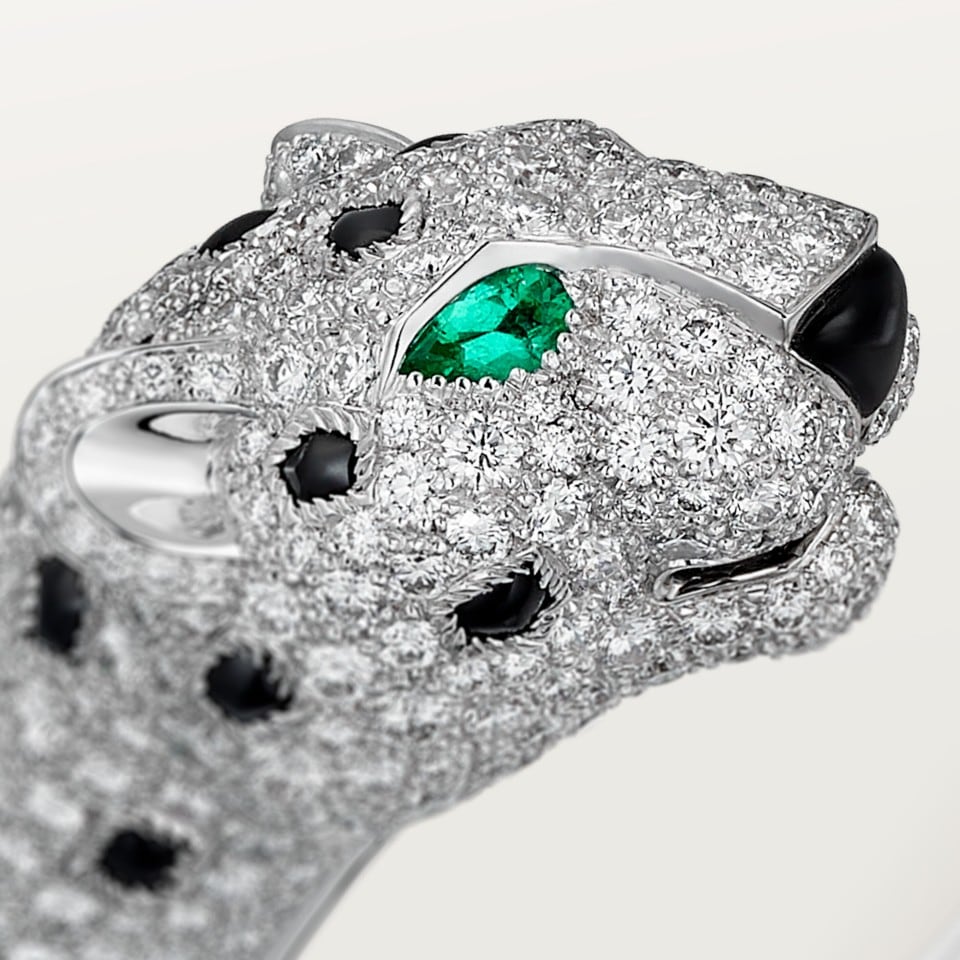 Panthère de Cartier 卡地亚猎豹手镯,750‰白金,镶嵌4颗祖母绿豹眼,80颗缟玛瑙豹斑,2颗缟玛瑙豹鼻和957颗钻石,总重10.81克拉(适用尺寸:17)。