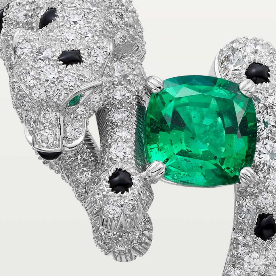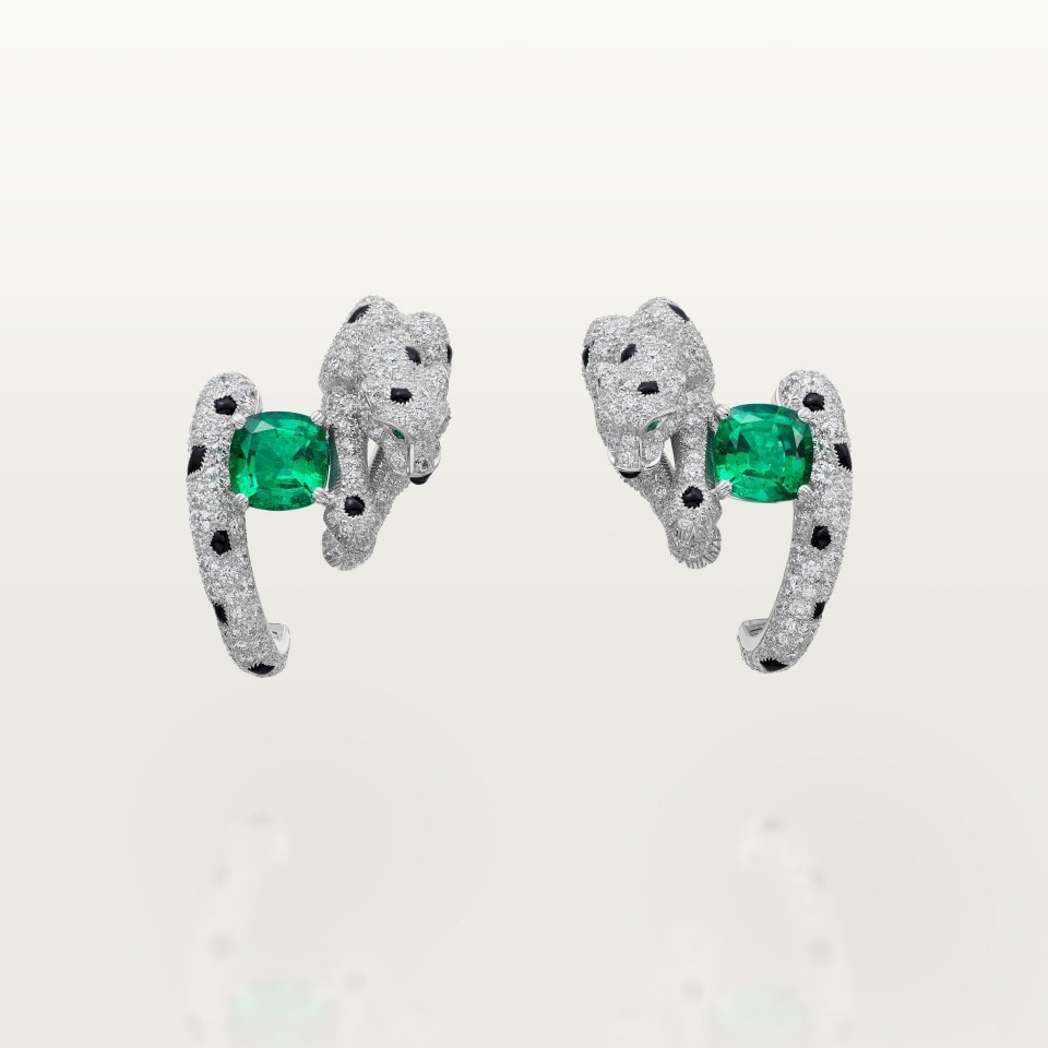 Panthère de Cartier卡地亚猎豹耳环,750/1000白金,共镶嵌2颗枕形祖母绿,单颗祖母绿重量备有1.00至1.35克拉可选,228颗钻石,总重2.43克拉,祖母绿和缟玛瑙。