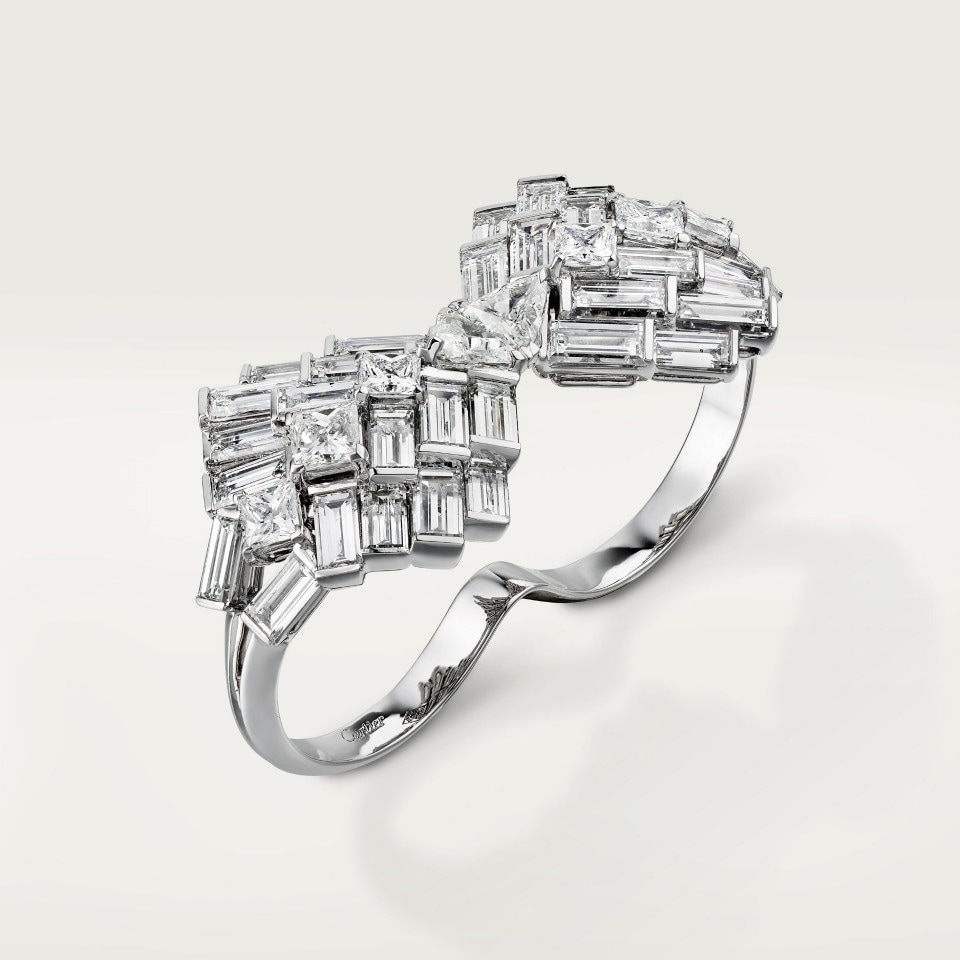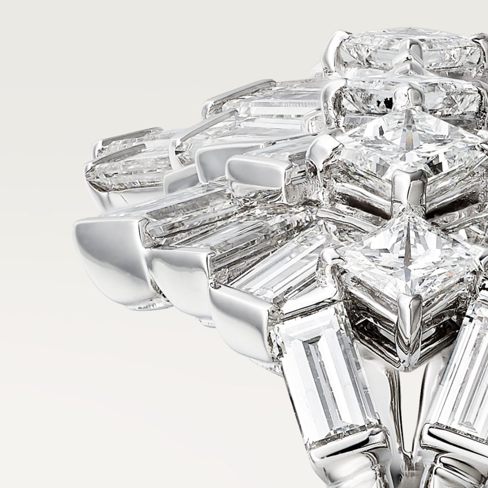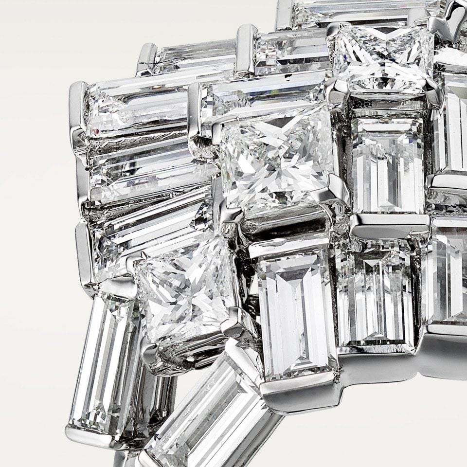Reflection de Cartier 戒指,750‰白金,镶嵌2颗三角锥形切割钻石,总重0.44克拉,6颗公主方形切割钻石,总重1.04克拉,32颗长方形切割钻石,总重4.39克拉(适用尺寸:52)。