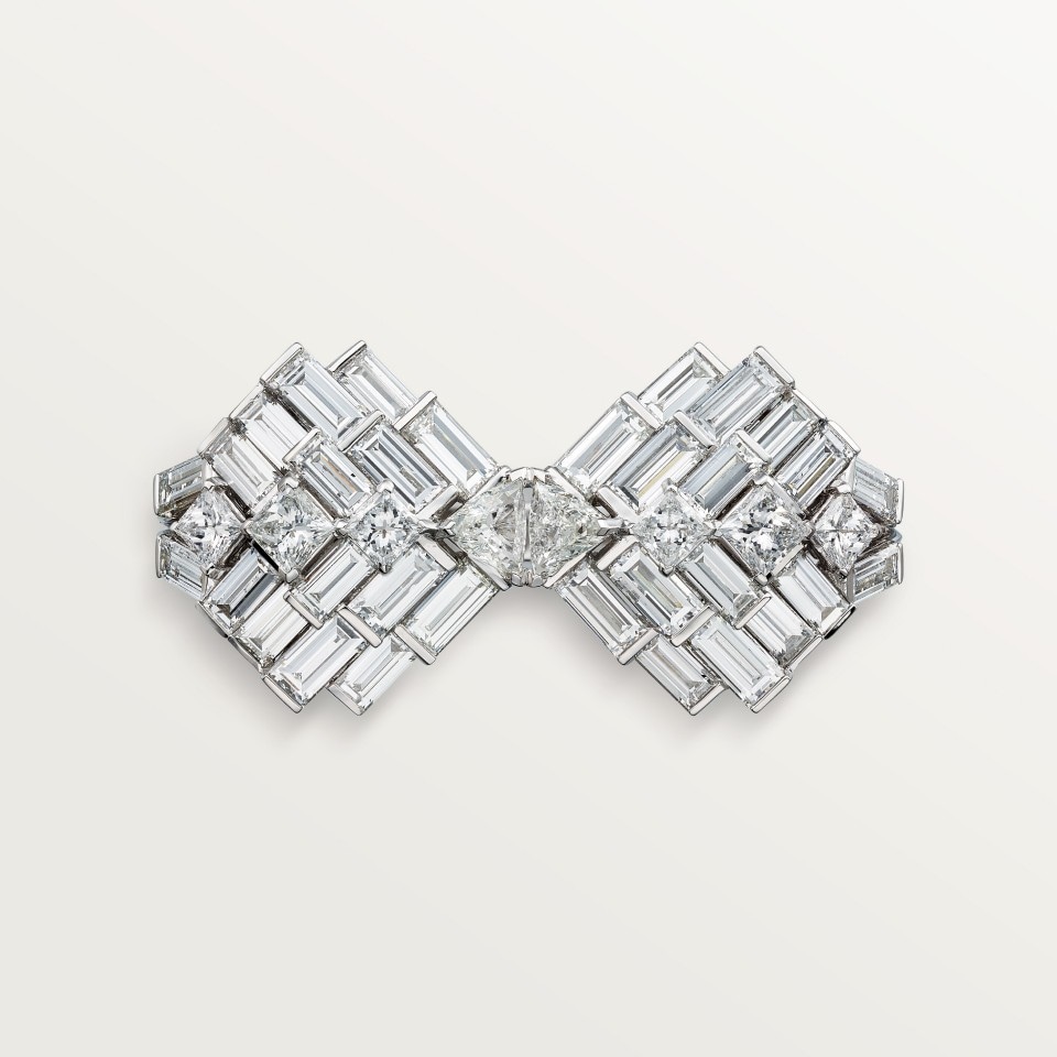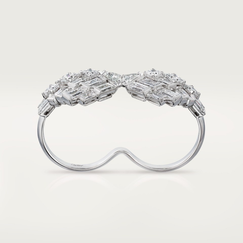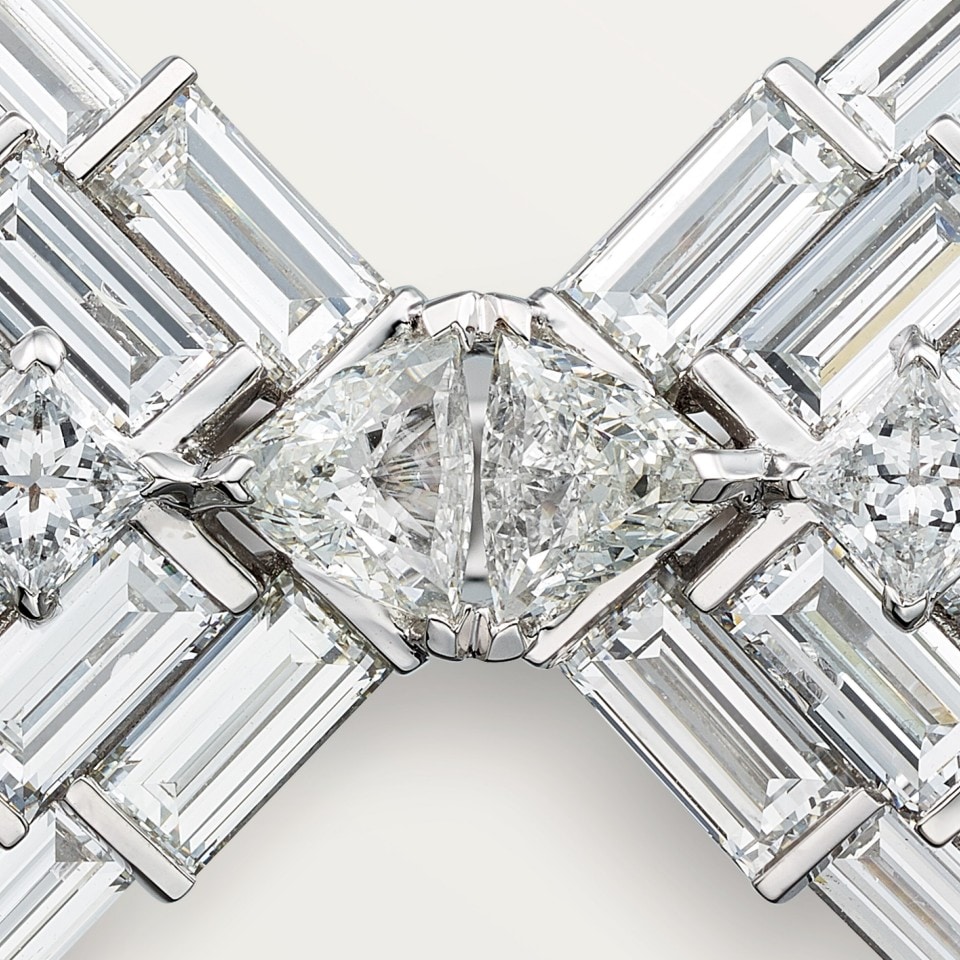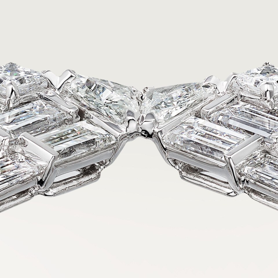 Reflection de Cartier 戒指,750‰白金,镶嵌2颗三角锥形切割钻石,总重0.44克拉,6颗公主方形切割钻石,总重1.04克拉,32颗长方形切割钻石,总重4.39克拉(适用尺寸:52)。