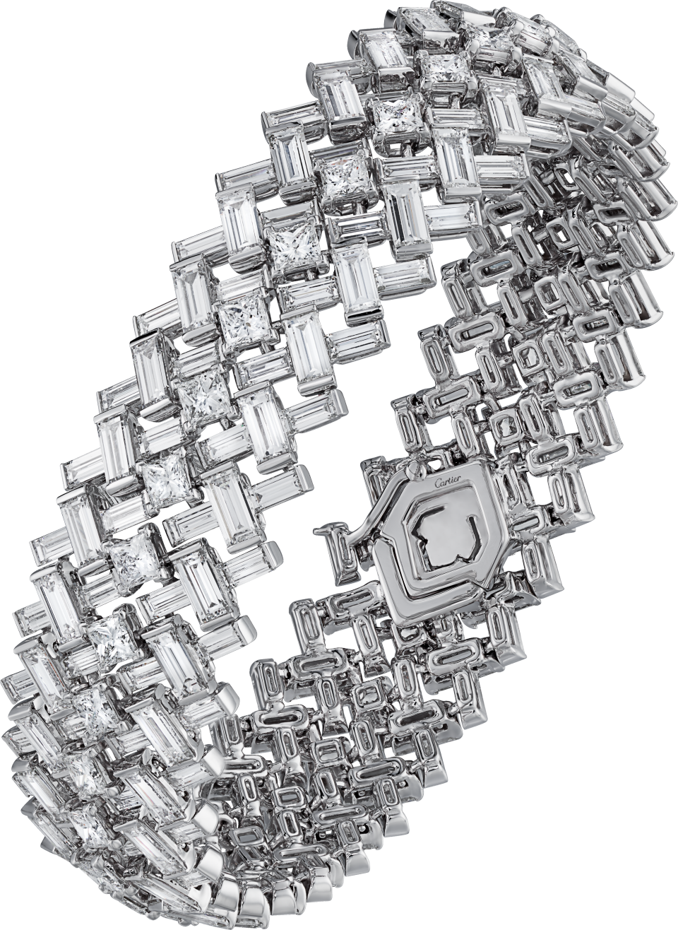 Reflection de Cartier手镯,750/1000白金,镶嵌210颗长方形切割钻石,总重18.27克拉,35颗公主方形切割钻石,总重4.09克拉。