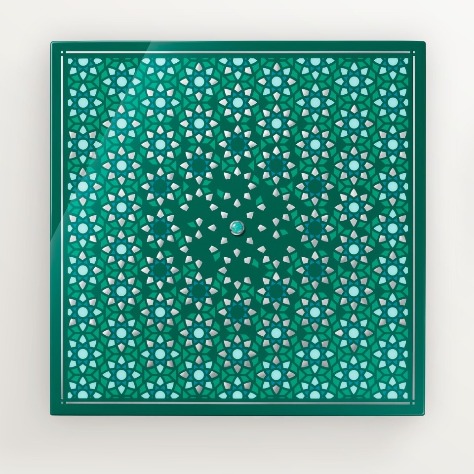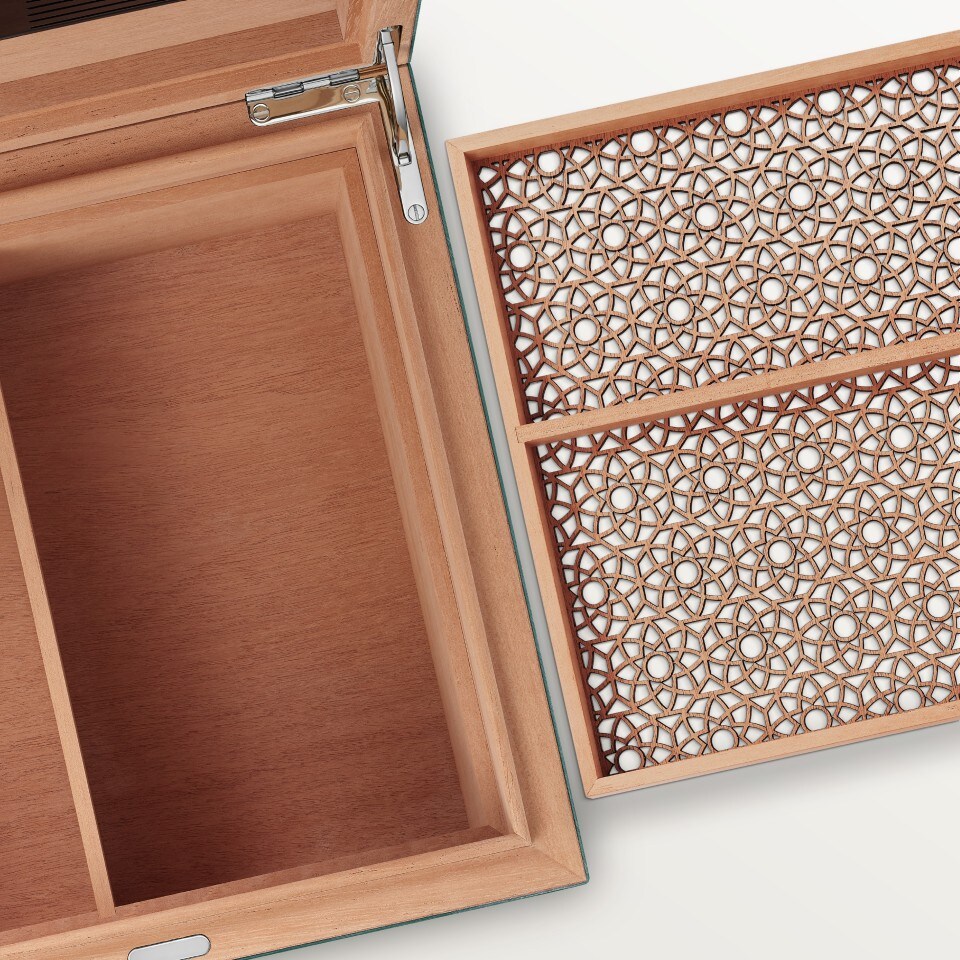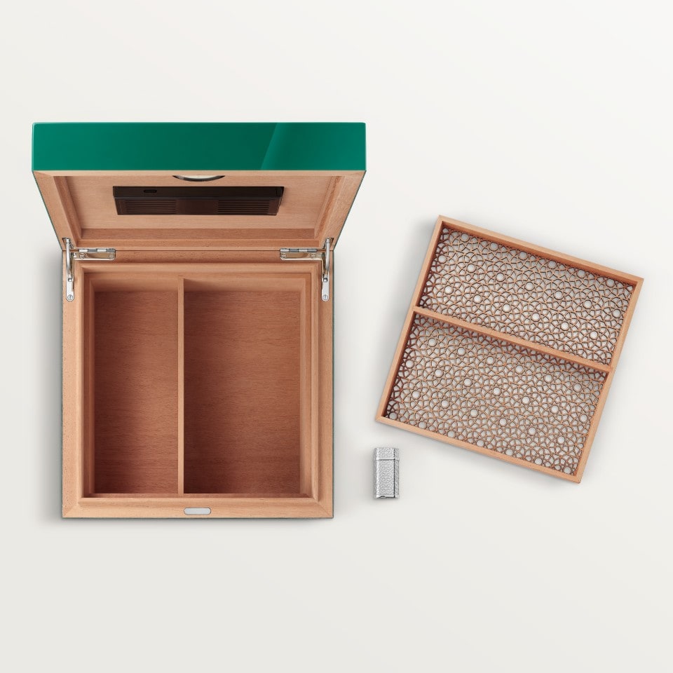 绿色清漆木雪茄盒,凸圆形天河石。内部搭配一个可拆卸托盘、加湿器和温度计。
