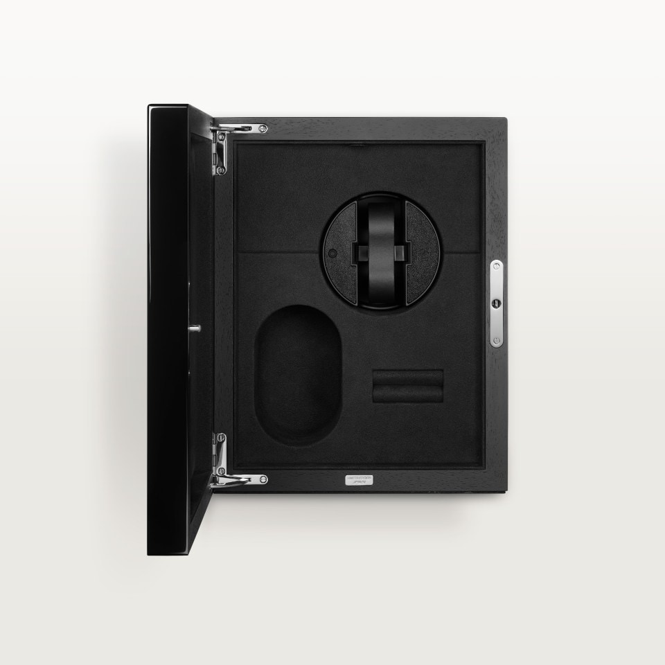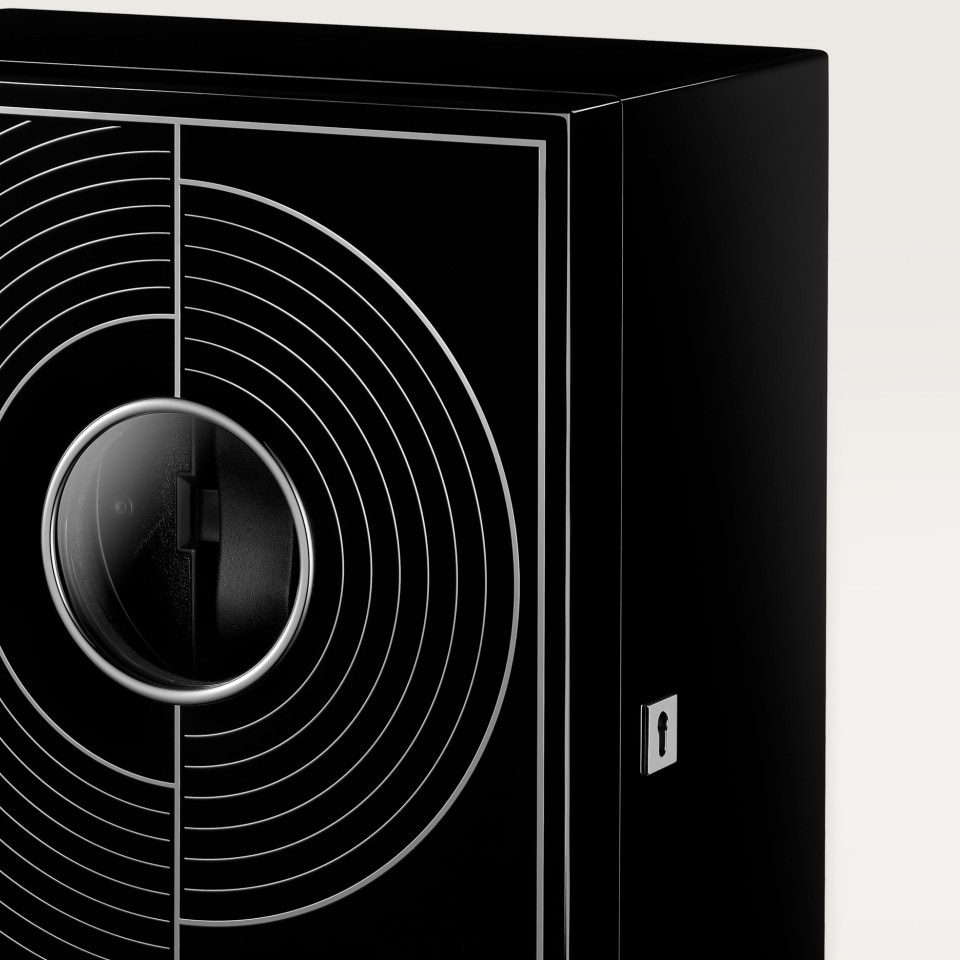 Masse Mystérieuse图案腕表盒、腕表旅行收纳盒与袖扣,黑色清漆木,银色图案,玻璃透镜,上链摆陀,黑色衬里。