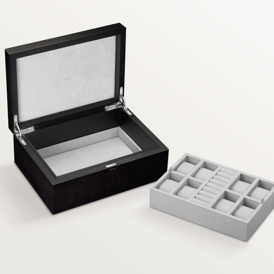 Santos de Cartier容纳八枚腕表和袖扣盒,清漆木质,盒底与内饰覆以织物。尺寸:宽33厘米 x 长23.8厘米 x 高12.8厘米。腕表和袖扣须单独购买,不随附于盒内销售。