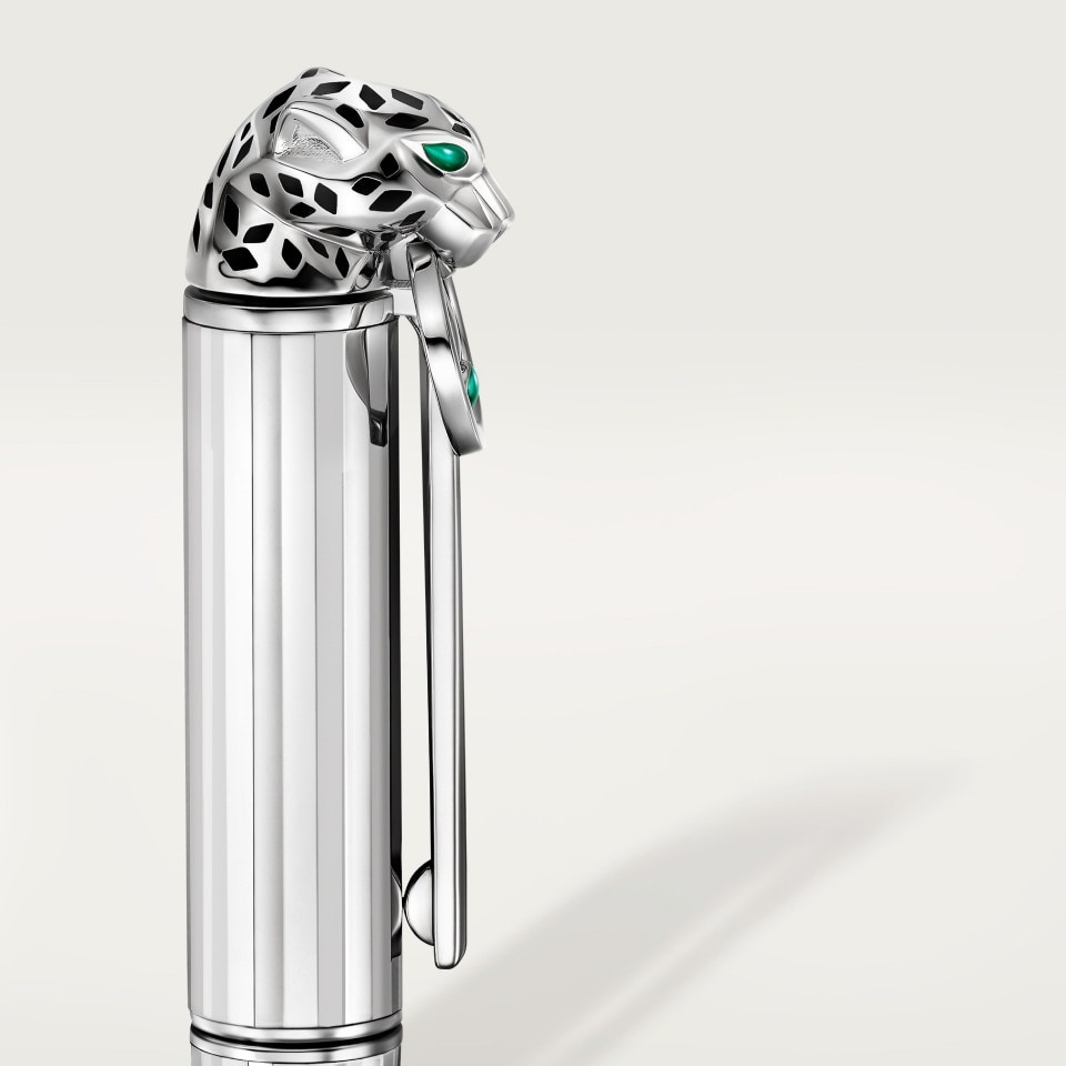 Panthère de Cartier圆珠笔,925/1000纯银笔杆和笔帽,饰以槽纹图案,豹首固定一枚925/1000纯银扣件戒指,黑漆豹斑,染色玛瑙豹眼,凸圆形戒指,镜面抛光饰面。