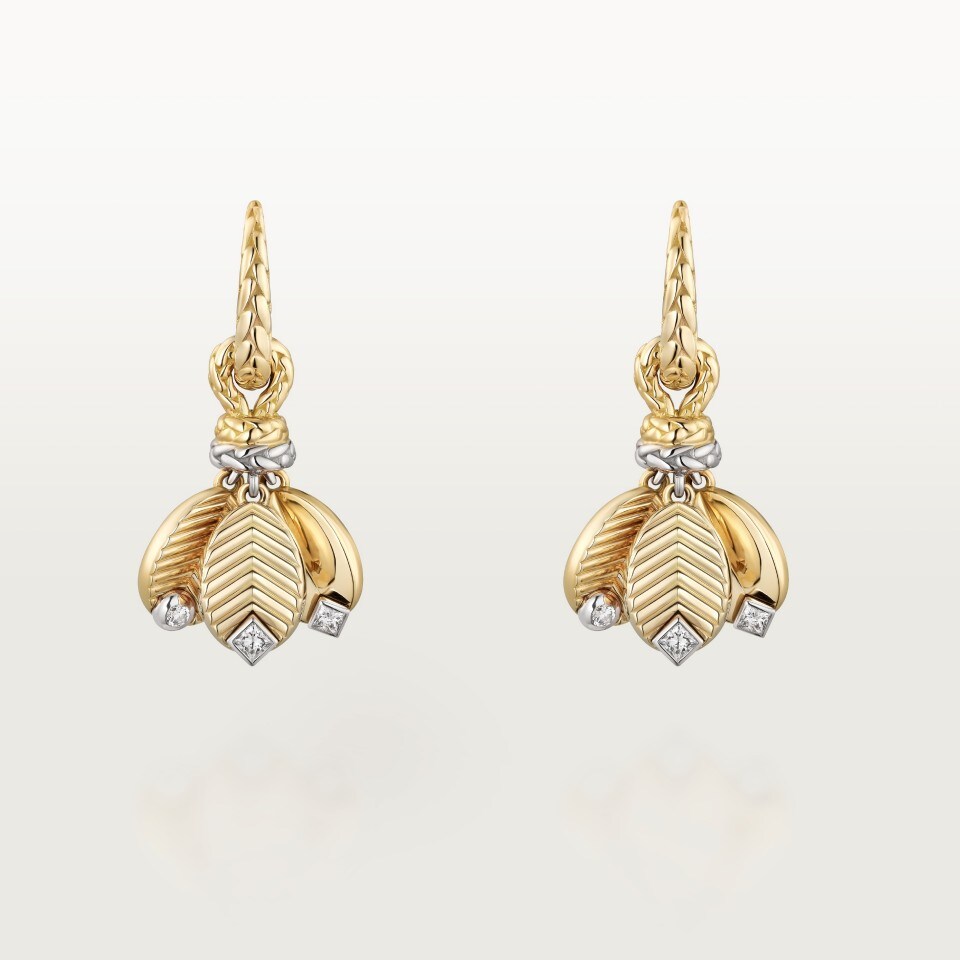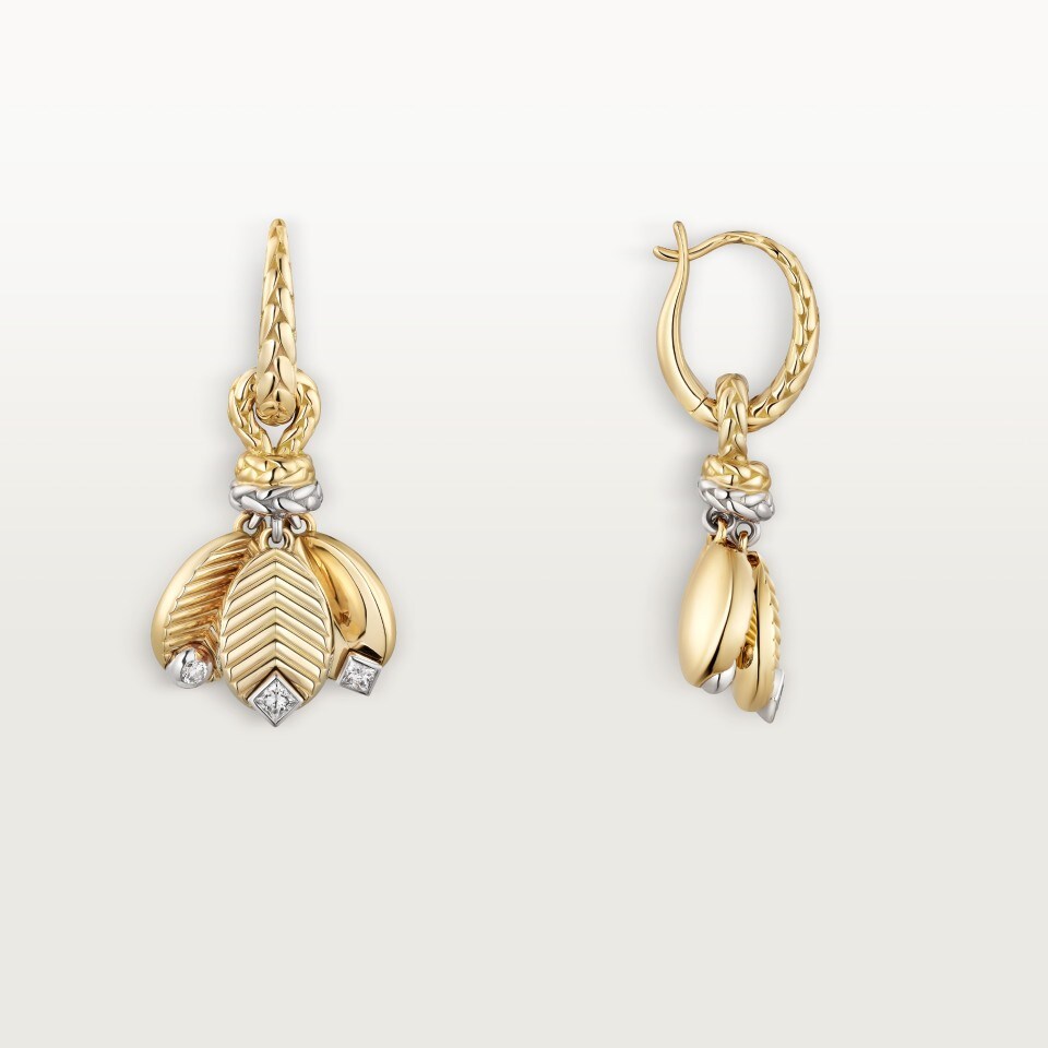 Grain de Café耳环,750/1000黄金,750/1000白金,镶嵌2颗圆形明亮式切割钻石,4颗公主方型切割钻石,总重0.24克拉。