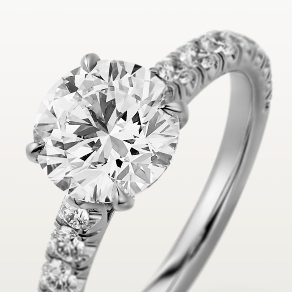 Solitaire 1895订婚钻戒,950/1000铂金,镶嵌1颗圆形明亮式切割钻石,备有0.30至4.99克拉可选,铺镶圆形明亮式切割钻石。