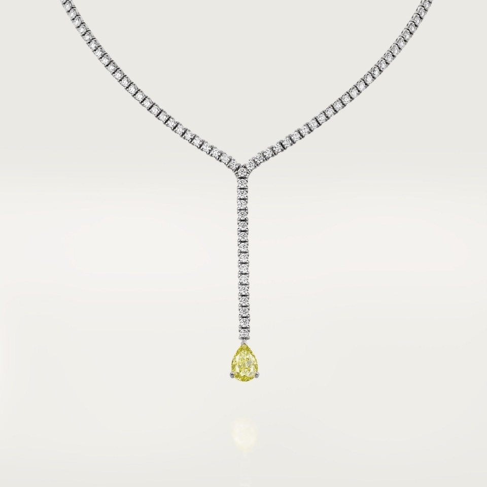 项链,750/1000白金,镶嵌1颗黄色梨形钻石,备有2.00至3.00克拉可选,铺镶圆形明亮式切割白色钻石。
