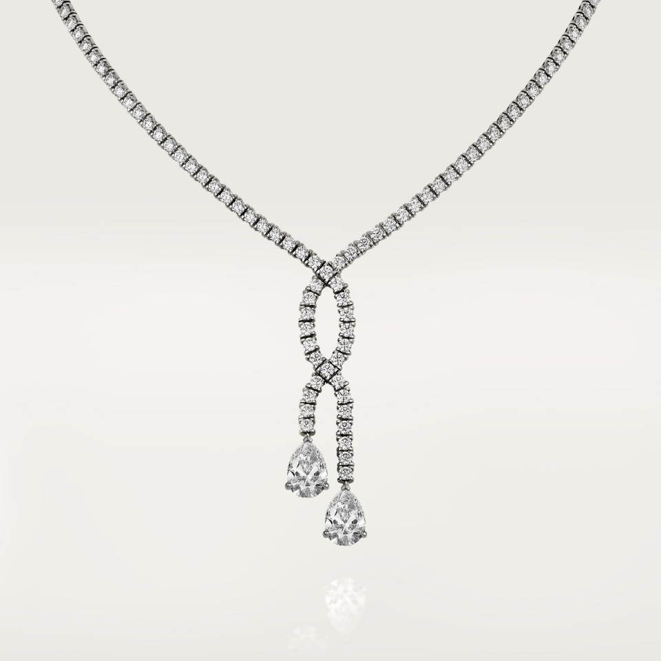项链,750/1000白金,镶嵌2颗梨形钻石,备有2.00至3.00克拉可选,铺镶圆形明亮式切割钻石。