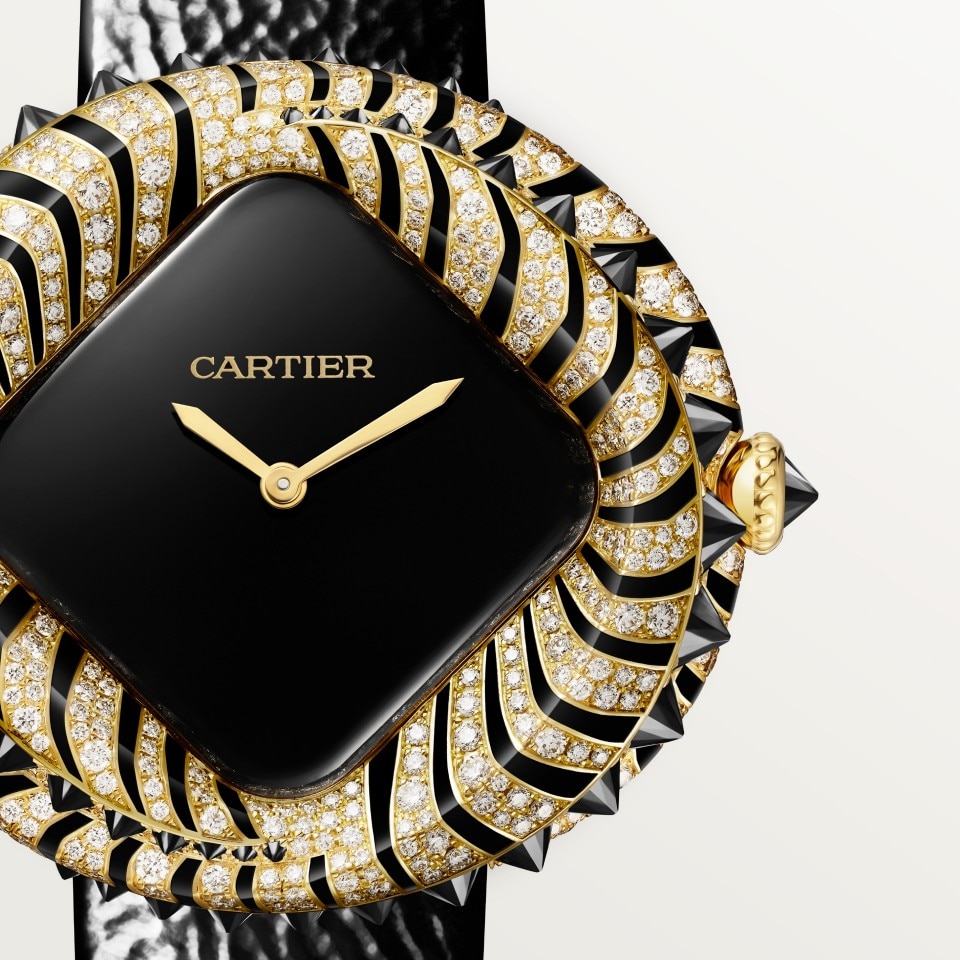 动物造型高级珠宝腕表,石英机芯。750/1000黄金表壳,镶嵌440颗明亮式切割圆钻,总重1.46克拉,44颗黑色尖晶石,黑色漆艺图案,750/1000黄金表冠,镶嵌一颗黑色尖晶石。缟玛瑙表盘,剑形镀金精钢指针。黑色小牛皮表带(随附一条黑色鳄鱼皮表带),750/1000黄金针扣式表扣,镶嵌21颗钻石,总重0.20克拉。