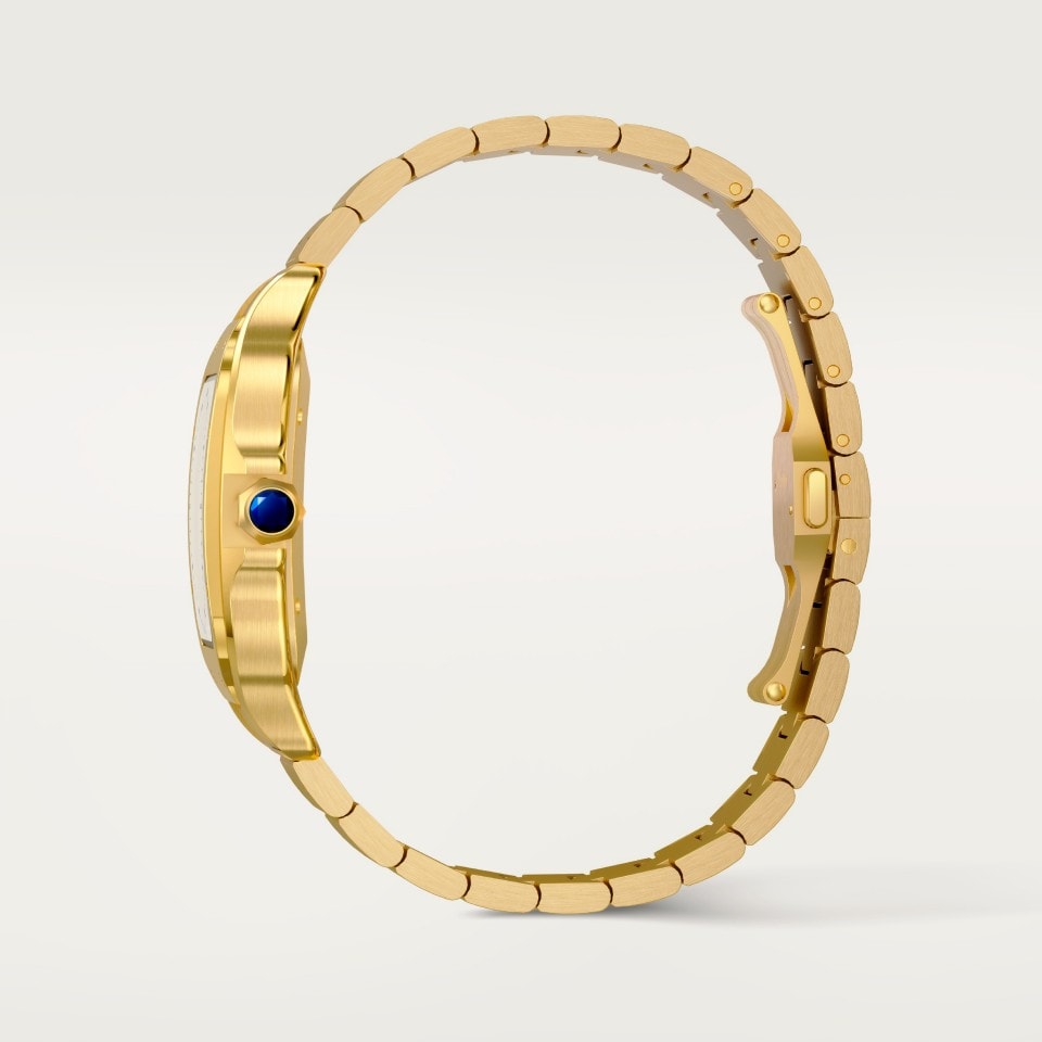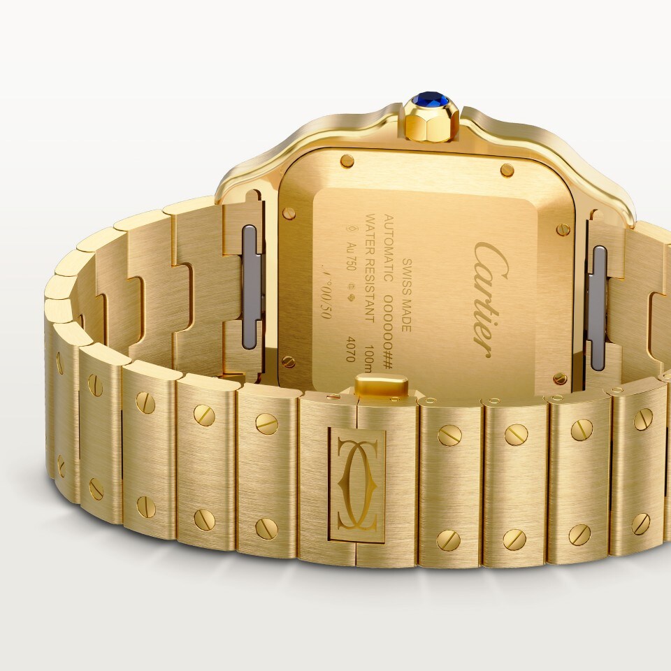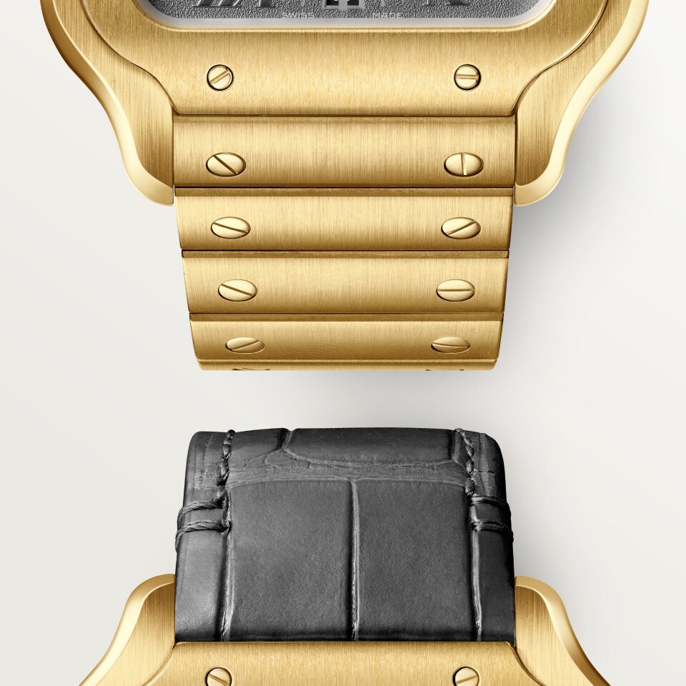 Santos系列腕表,大号表款,卡地亚1847 MC型工作坊精制自动上链机械机芯。750/1000黄金表壳,750/1000黄金七边形表冠,镶嵌1颗多切面蓝宝石,哑光炭灰色粒纹表盘,雕刻计时器,镀金饰面指针,合成蓝宝石水晶镜面。750/1000黄金表链,配备“SmartLink”金属表链调节系统。随附一条鳄鱼皮表带,搭配可替换式750/1000黄金折叠表扣。表带和表链均配备“QuickSwitch”表带快速替换系统。表壳宽度:39.8毫米,厚度:9.38毫米。生活防水深度10巴(约100米)。