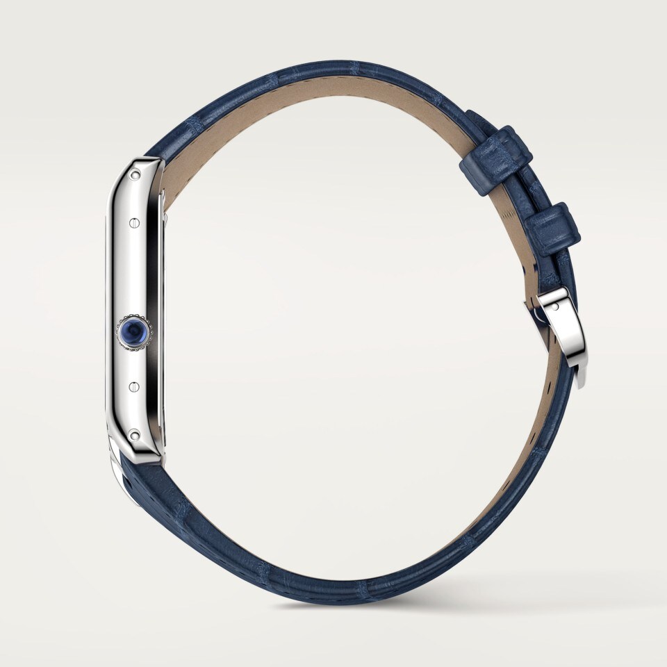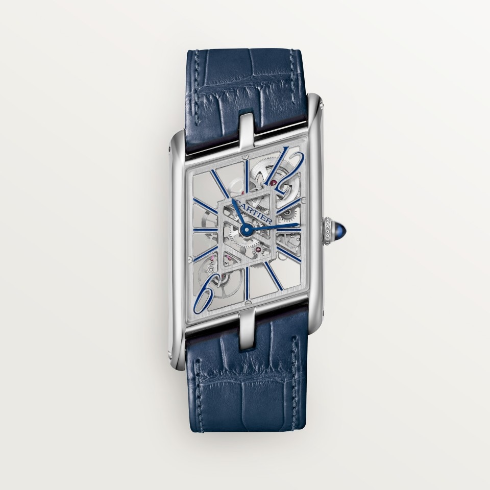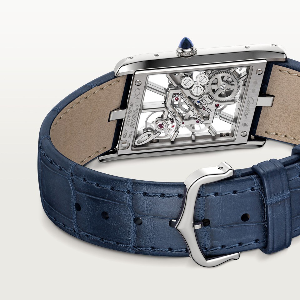 Tank Asymétrique腕表,镂空,卡地亚9623 MC型工作坊精制手动上链机械机芯。铂金表壳,圆珠形表冠镶嵌一颗蓝宝石,剑形蓝钢指针,海军蓝和黑色鳄鱼皮表带,950‰铂金针扣式表扣。蓝漆阿拉伯数字形镂空表桥显示小时和分钟。机芯由112枚零部件组成,其中包含22枚红宝石轴承。机芯尺寸:32毫米 x 21.10毫米。机芯厚度:4.20毫米。摆轮振频:每小时28,800次。动力储存:约48小时。表壳尺寸:47.17毫米 x 26.20毫米。厚度:7.82毫米。编号并限量发售100枚。防水深度3巴(约30米)。