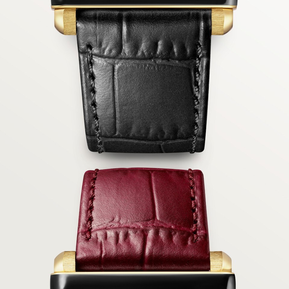 一条黑色鳄鱼皮表带和一条红色鳄鱼皮表带,750‰黄金针扣式表扣。镂空表桥标明小时和分钟,覆以黑色和红色漆艺。