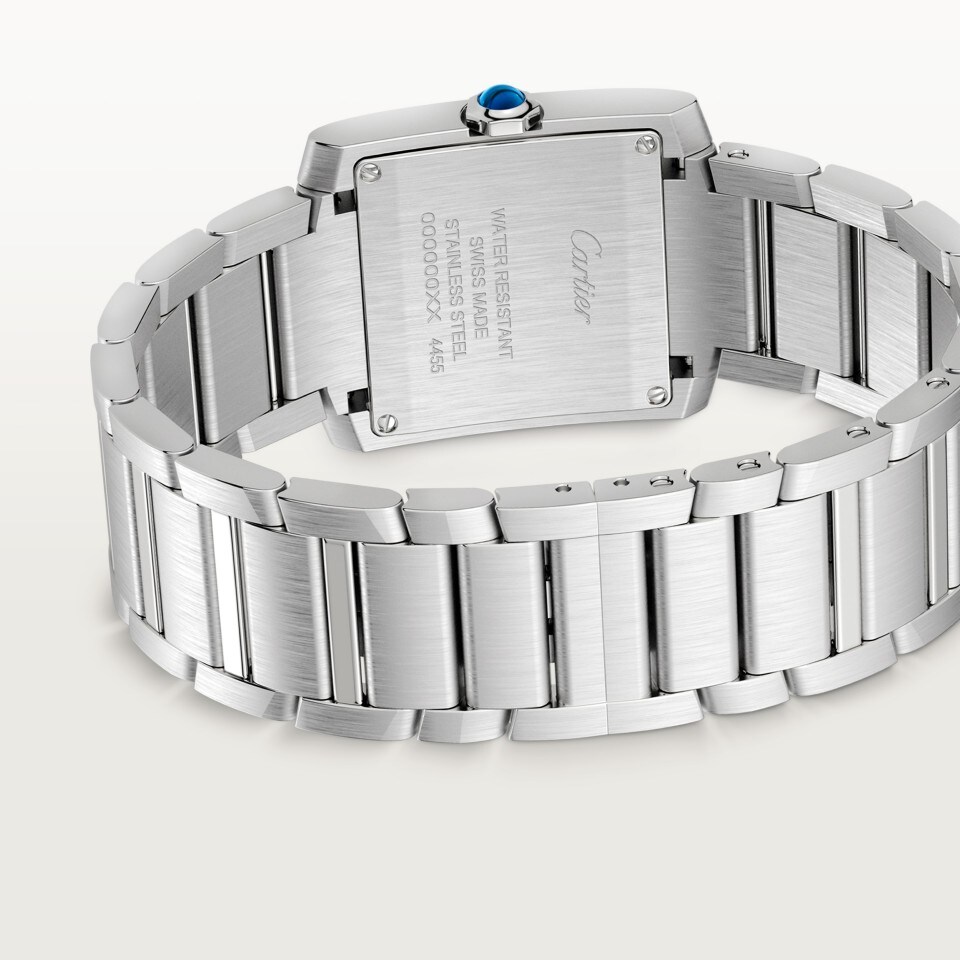 Tank Française腕表,中号表款,石英机芯。精钢表壳。精钢多切面表冠,镶嵌一颗凸圆形合成尖晶石。银白色表盘,剑形蓝钢指针,合成蓝宝石水晶镜面。精钢表链。表壳尺寸:32 毫米 x 27 毫米。厚度:7.1 毫米。生活防水深度3巴(约30米)。